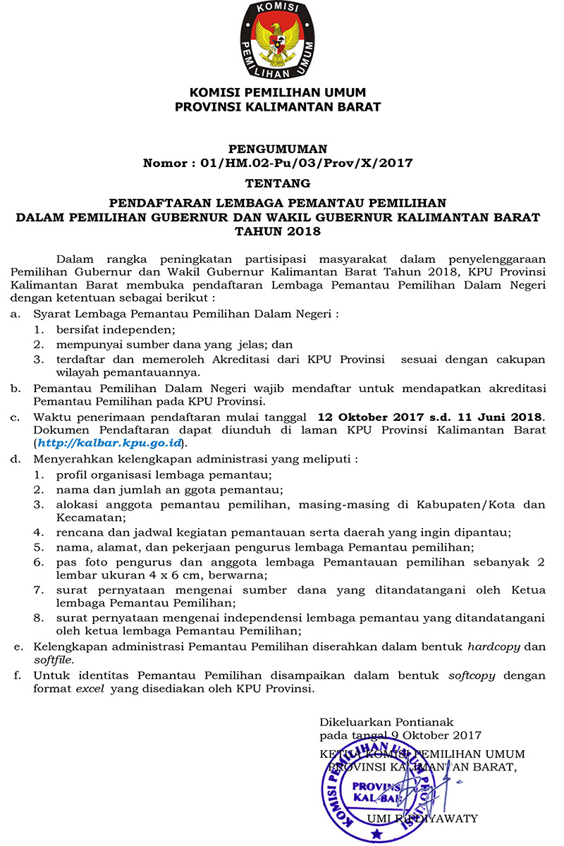 Berikut disampaikan Pengumuman Pendaftaran Pemantau Pemilihan dalam Pemilihan Gubernur dan Wakil Gubernur Kalimantan Barat Tahun 2018. Dokumen kelengkapan administrasi dapat diunduh pada link dibawah ini :