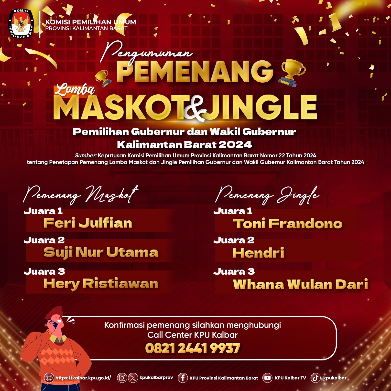 kalbar.kpu.go.id - Pontianak, Berikut disampaikan Pengumuman Nomor : 10/PP.06.2-Pu/61/2.1/2024 tentang Pemenang Lomba Maskot dan Jingle Pemilihan Gubernur dan Wakil Gubernur Kalimantan Barat Tahun 2024.