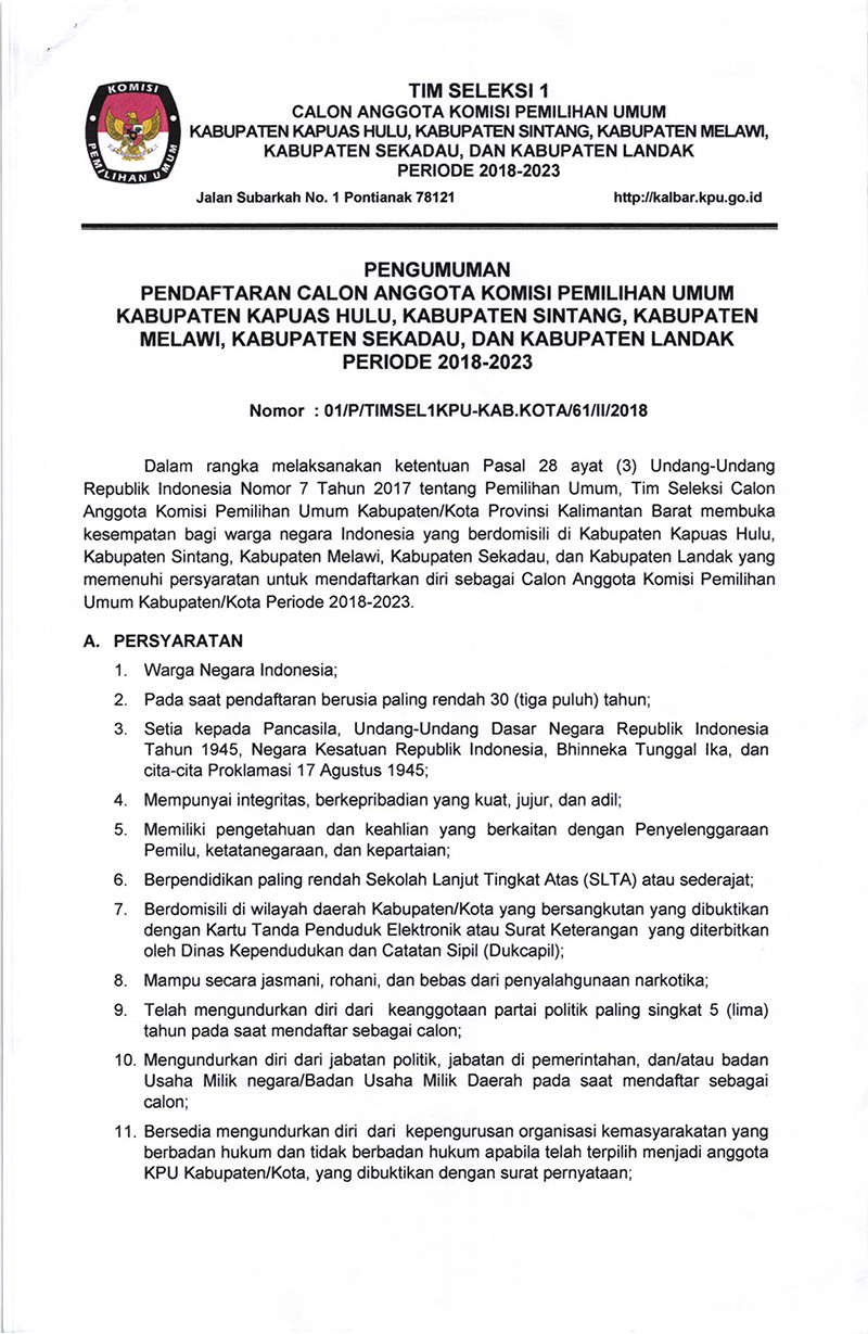 kalbar.kpu.go.id - Berikut disampaikan Pengumuman Pendaftaran Calon Anggota KPU Kabupaten/Kota Wailayah I dan II.