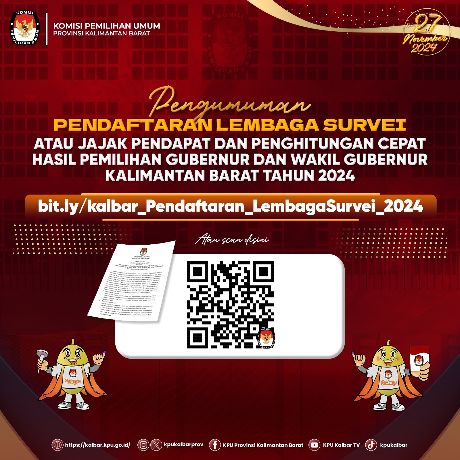 kalbar.kpu.go.id - Berikut disampaikan Pengumuman KPU Kalbar Nomor 11/PL.02-Pu/61/2.1/2024 tentang Pendaftaran Lembaga Survei atau Jajak Pendapat dan Penghitungan Cepat Hasil Pemilihan Gubernur dan Wakil Gubernur Kalimantan Barat Tahun 2024.