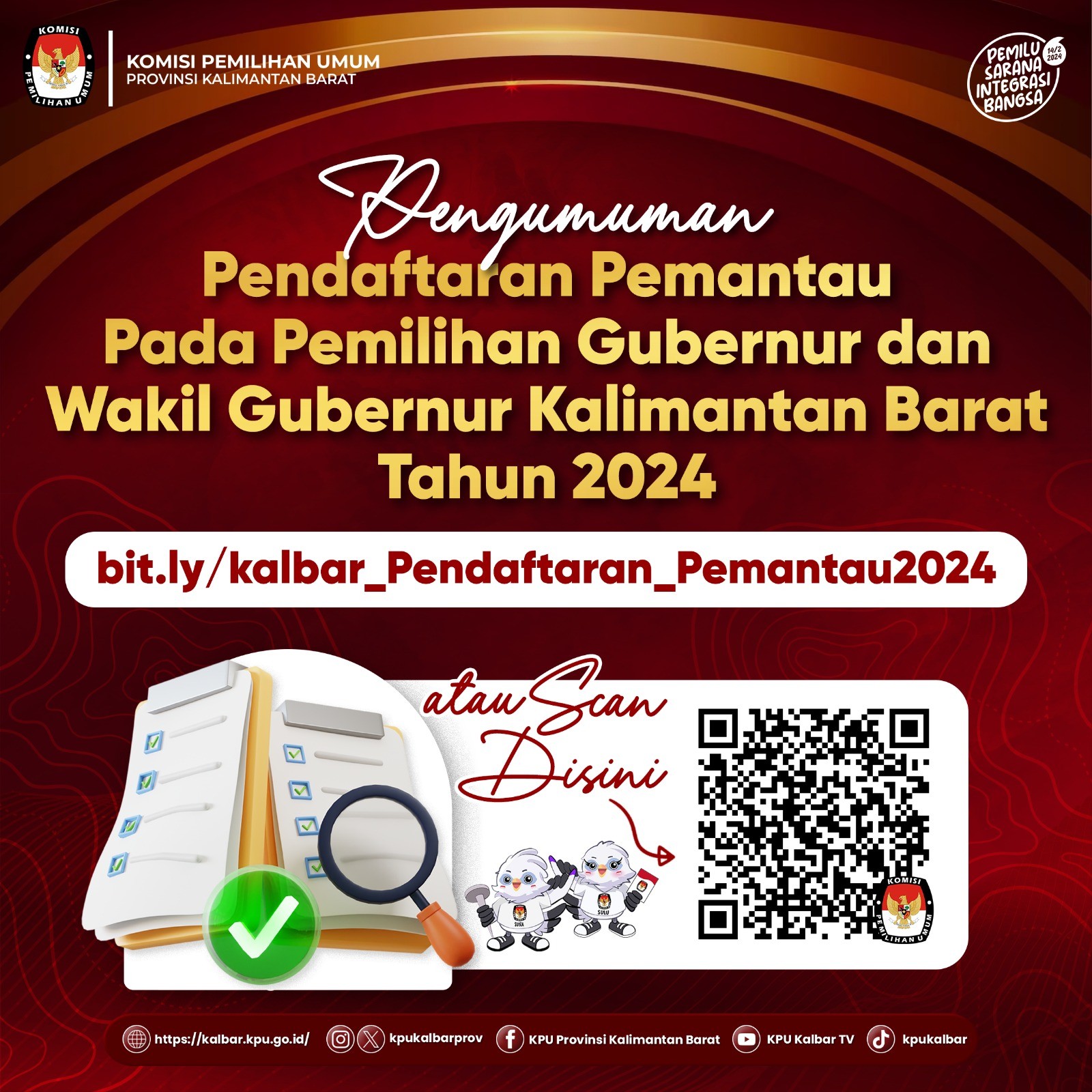 kalbar.kpu.go.id - Berikut disampaikan Pengumuman Nomor : 6/PL.02-Pu/61/2.1/2024 tentang Pendaftaran Pemantau Pada Pemilihan Gubernur dan Wakil Gubernur Kalimantan Barat Tahun 2024.