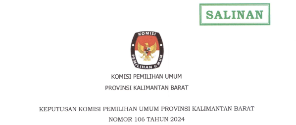 kalbar.kpu.go.id - Pontianak, Berikut ini disampaikan Komisi Pemilihan Umum Provinsi Kalimantan Barat Nomor 106 Tahun 2024 tentang Penetapan Hasil Pemilihan Gubernur dan Wakil Gubernur Provinsi Kalimantan Barat Tahun 2024.