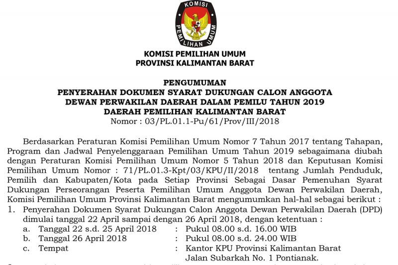 kalbar.kpu.go.id - Berikut disampaikan Pengumuman Penyerahan Dokumen Syarat Dukungan Calon Anggota Dewan Perwakilan Daerah dalam Pemilu Tahun 2019 Daerah Pemilihan Kalimantan Barat.