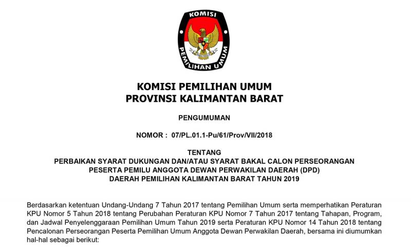 kalbar.kpu.go.id - Berikut disampaikan Pengumuman Nomor : 07/PL.01.1-Pu/61/Prov/VII/2018 tentang Perbaikan Syarat Dukungan dan/atau Syarat Bakal Calon Perseorangan Peserta Pemilu Anggota Dewan Perwakilan Daerah (DPD) Daerah Pemilihan Kalimantan Barat Tahun 2019.