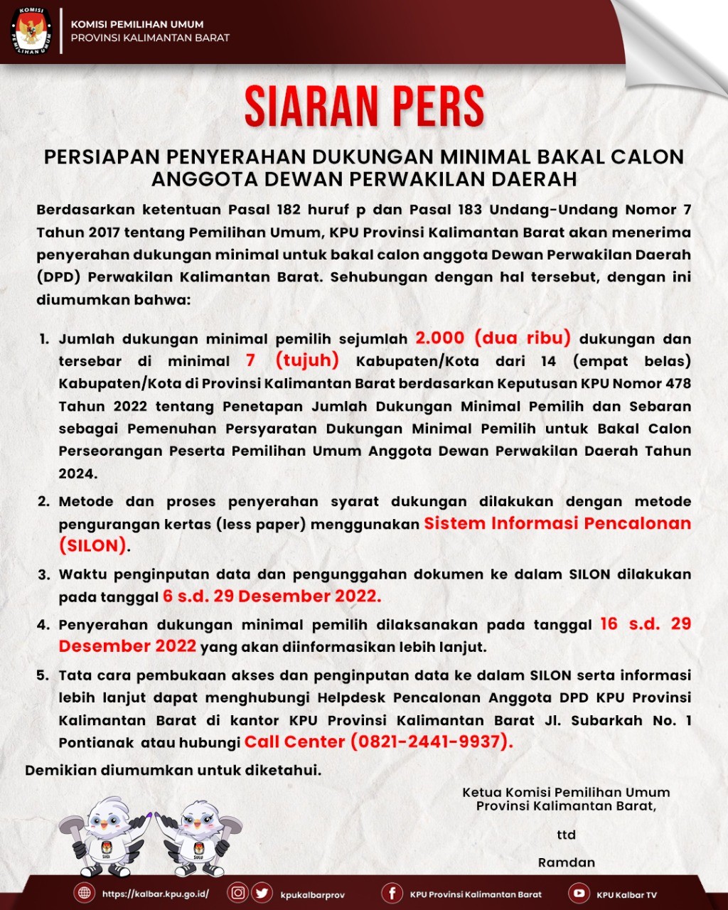 kalbar.kpu.go.id - Pontianak, Berikut disampaikan Pengumuman Nomor : 145/PL.01.1-Pu/61/2.1/2022 tentang Persiapan Penyerahan Dukungan Minimal Bakal Calon Anggota Dewan Perwakilan Daerah (DPD).