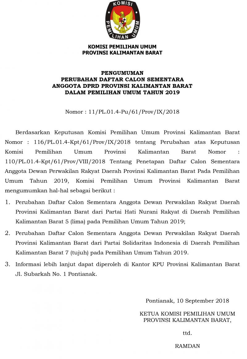 Pengumuman Perubahan DCS Anggota DPRD Provinsi Kalbar Pemilu 2019