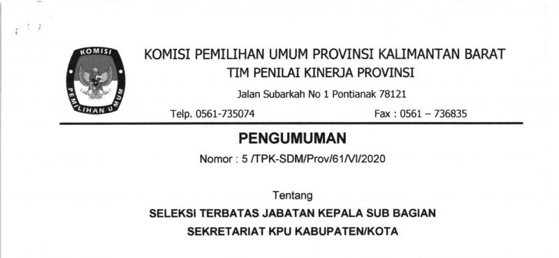 kalbar.kpu.go.id - Berikut disampaikan Pengumuman Nomor : 5/TPK-SDM/Prov/61/VI/2020 tentang Seleksi Terbatas Jabatan Kepala Sub Bagian Sekretariat KPU Kabupaten/Kota.