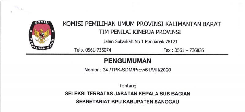Pontianak, kalbar.kpu.go.id - Pengumuman Nomor : 24/TPK-SDM/Prov/61/VII/2020 tentang Seleksi Terbatas Jabatan Kepala Sub Bagian Sekretariat KPU Kabupaten Sanggau.
