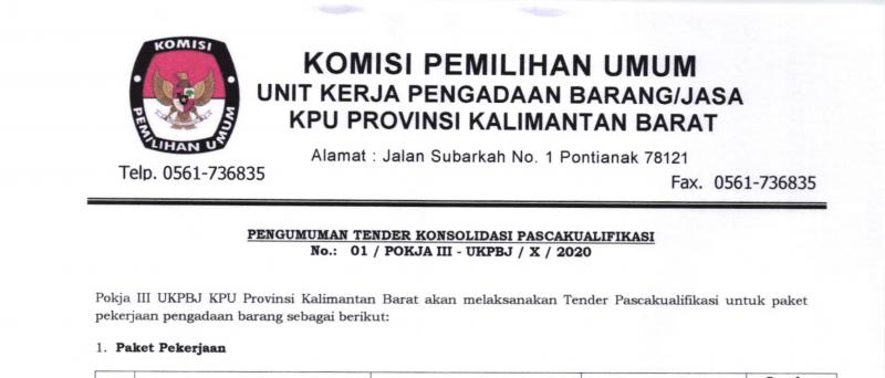 Pokja III UKPBJ KPU Provinsi Kalimantan Barat akan melaksanakan Tender Pascakualifikasi untuk paket pekerjaan pengadaan Barang / Jasa