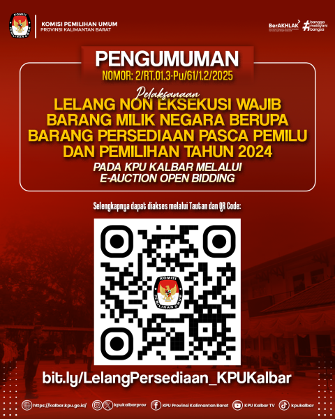 Pengumuman tentang Pelaksanaan Lelang Non Eksekusi Wajib Barang Milik Negara Berupa Barang Persediaan Pasca Pemilu dan Pemilihan Tahun 2024 pada KPU Kalbar Melalui E-Auction Open Bidding