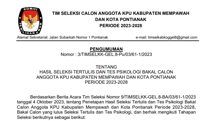 kalbar.kpu.go.id - Pontianak, Berikut disampaikan Pengumuman Nomor : 3/TIMSELKK-GEL.8-Pu/03/61-1/2023 tentang Hasil Seleksi Tertulis dan Tes Psikologi Bakal Calon Anggota KPU Kabupaten Mempawah dan Kota Pontianak Periode 2023-2028.