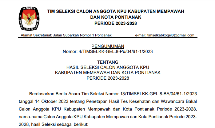 kalbar.kpu.go.id - Berikut disampaikan Pengumuman Nomor: 4/TIMSELKK-GEL.8-Pu/04/61-1/2023 tentang Hasil Seleksi Calon Anggota KPU Kabupaten Mempawah dan Kota Pontianak Periode 2023-2028.