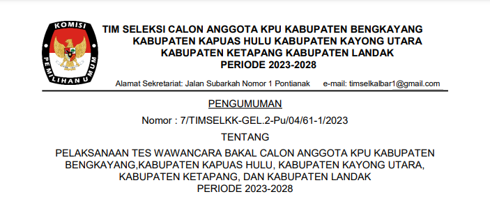 kalbar.kpu.go.id - Pontianak, Berikut disampaikan Pengumuman TIm Seleksi Anggota KPU Kabupaten/Kota Nomor 7/TIMSELKK-GEL.2-Pu/04/61-1/2023 tentang Pelaksanaan Tes Wawancara Bakal Calon Anggota Kpu Kabupaten Bengkayang, Kabupaten Kapuas Hulu, Kabupaten Kayong Utara, Kabupaten Ketapang, dan Kabupaten Landak Periode 2023-2028.