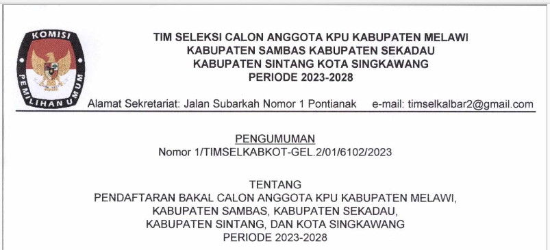 Pengumuman Timsel II No 1 Tahun 2023 tentang Pendaftaran Bakal Calon Anggota KPU Kabupaten Melawi, Kabupaten Sambas, Kabupaten Sekadau, Kabupaten Sintang dan Kota Singkawang periode 2023-2028.