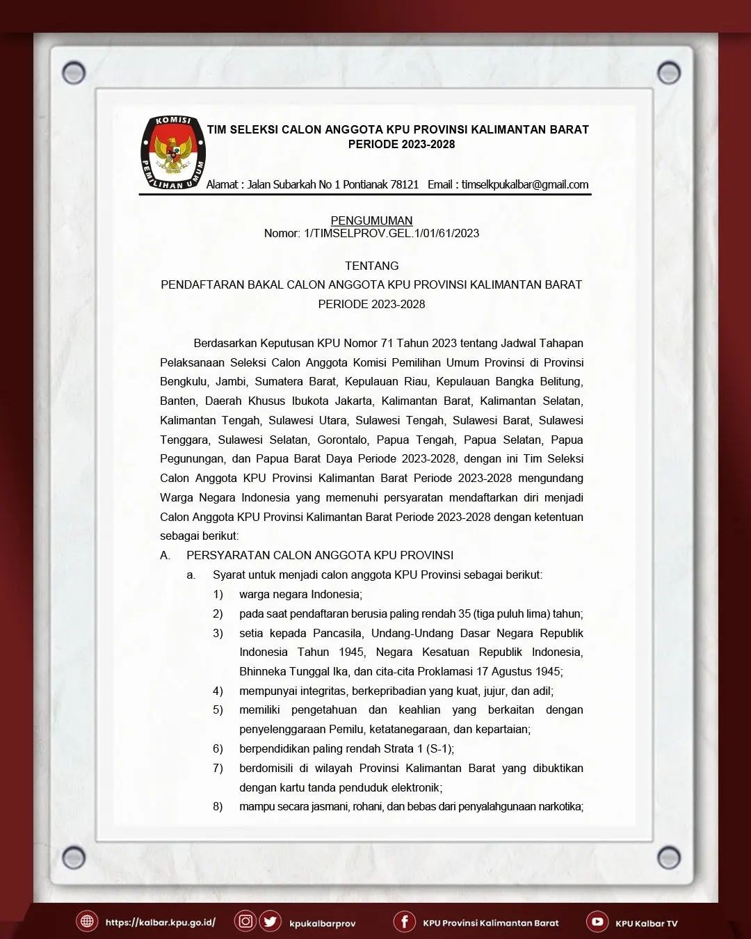 Berdasarkan Keputusan KPU Nomor 71 Tahun 2023 tentang Jadwal Tahapan Pelaksanaan Seleksi Calon Anggota Komisi Pemilihan Umum Provinsi di Provinsi Bengkulu, Jambi, Sumatera Barat, Kepulauan Riau, Kepulauan Bangka Belitung, Banten, Daerah Khusus Ibukota Jakarta, Kalimantan Barat, Kalimantan Selatan, Kalimantan Tengah, Sulawesi Utara, Sulawesi Tengah, Sulawesi Barat, Sulawesi Tenggara, Sulawesi Selatan, Gorontalo, Papua Tengah, Papua Selatan, Papua Pegunungan, dan Papua Barat Daya Periode 2023-2028, dengan ini Tim Seleksi Calon Anggota KPU Provinsi Kalimantan Barat Periode 2023-2028 mengundang Warga Negara Indonesia yang memenuhi persyaratan mendaftarkan diri menjadi Calon Anggota KPU Provinsi Kalimantan Barat Periode 2023-2028 dengan ketentuan sebagai berikut: