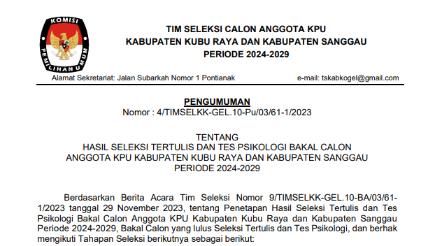 kalbar.kpu.go.id - Berikut disampaikan Pengumuman Nomor: 4/TIMSELKK-GEL.10-Pu/03/61-1/2023 tentang Hasil Seleksi Tertulis dan Tes Psikologi Bakal Calon Anggota KPU Kabupaten Kubu Raya dan Kabupaten Sanggau Periode 2024-2029.