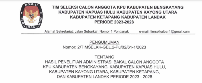 Pengumuman Timsel Nomor 2 Tahun 2023 Hasil Peneilitan Administrasi Balon Anggota KPU Kabupaten Bengkayang, Kapuas Hulu, Kayong Utara, Ketapang dan Kabupaten Landak