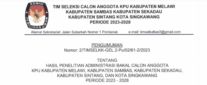 Pengumuman Timsel Nomor 2 Tahun 2023 Hasil Peneilitan Administrasi Balon Anggota KPU Kabupaten Melawi, Sambas, Sekadau, Sintang dan Kota Singkawang