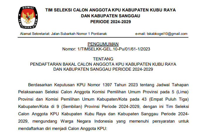 Pengumuman Timsel, Pendaftaran Anggota KPU Kubu Raya dan Kabupaten Sanggau
