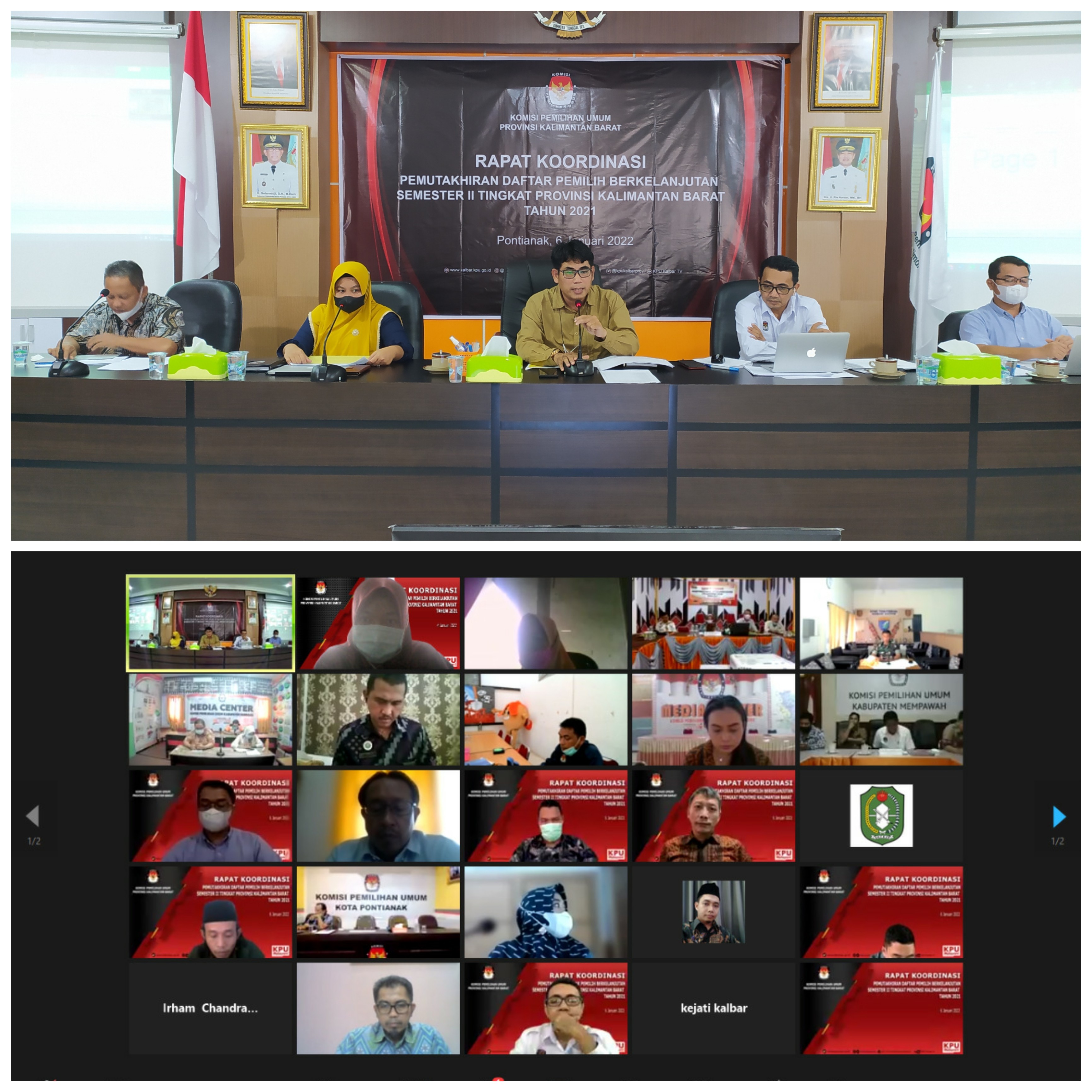 Pontianak - KPU Provinsi Kalimantan Barat menggelar Rapat Koordinasi Pemutakhiran Daftar Pemilih Berkelanjutan Semester II Tingkat Provinsi Kalimantan Barat Tahun 2021 secara daring dengan mengundang Forkopimda, Bawaslu Kalbar, Instansi/Lembaga Pemerintah, KPU Kabupaten/Kota se-Kalimantan Barat, dan Partai Politik tingkat Provinsi Kalimantan Barat, Kamis (6/1).