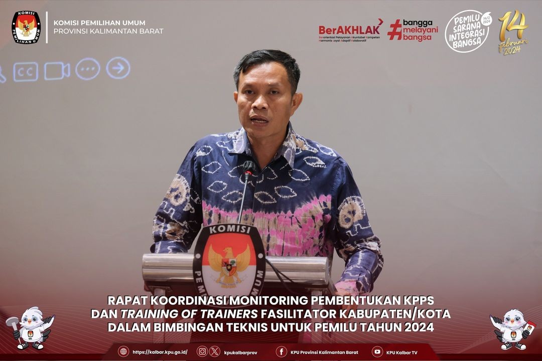 Ketua KPU Kalbar membuka acara Rapat Koordinasi Monitoring Pembentukan KPPS dan Training Of Trainers Fasilitator Kabupaten/Kota dalam Bimbingan Teknis untuk Pemilu Tahun 2024, di Hotel Mercure Pontianak, Selasa (16/1). Kegiatan ini dihadiri oleh Ketua dan Anggota serta Kepala Sub Bagian Hukum dan SDM KPU Kabupaten/Kota se-Kalimantan Barat.