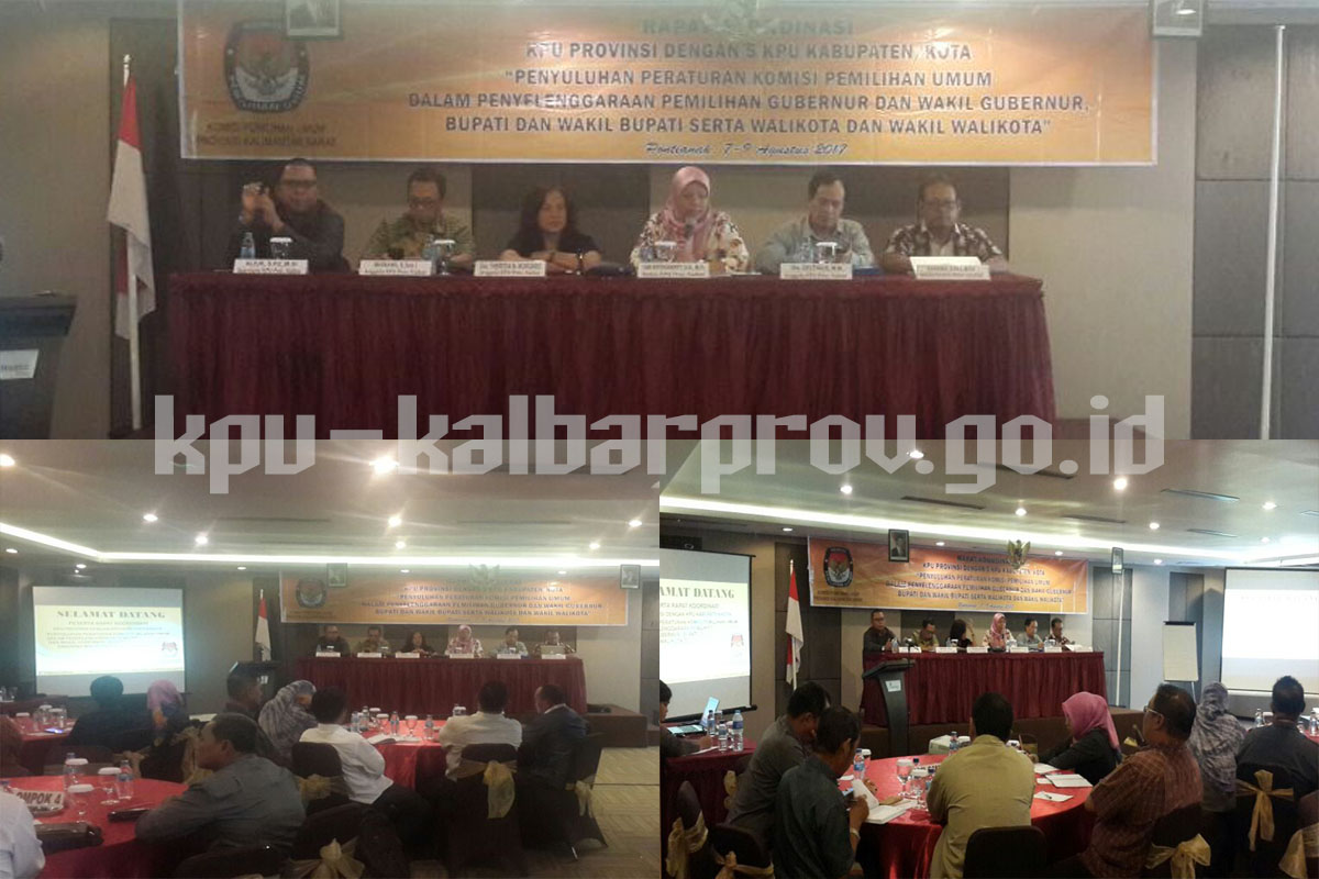kpu-kalbarprov.go.id – Pontianak, Komisi Pemilihan Umum (KPU) Provinsi Kalimantan Barat dengan melaksanakan Rapat Koordinasi (Rakor) Penyuluhan Peraturan KPU dalam Penyelenggaraan Pemilihan Gubernur dan Wakil Gubernur, Bupati dan Wakil Bupati dan/atau Walikota dan Wakil Walikota bertempat di Hotel Orchardz Perdana Pontianak, senin (7/8).