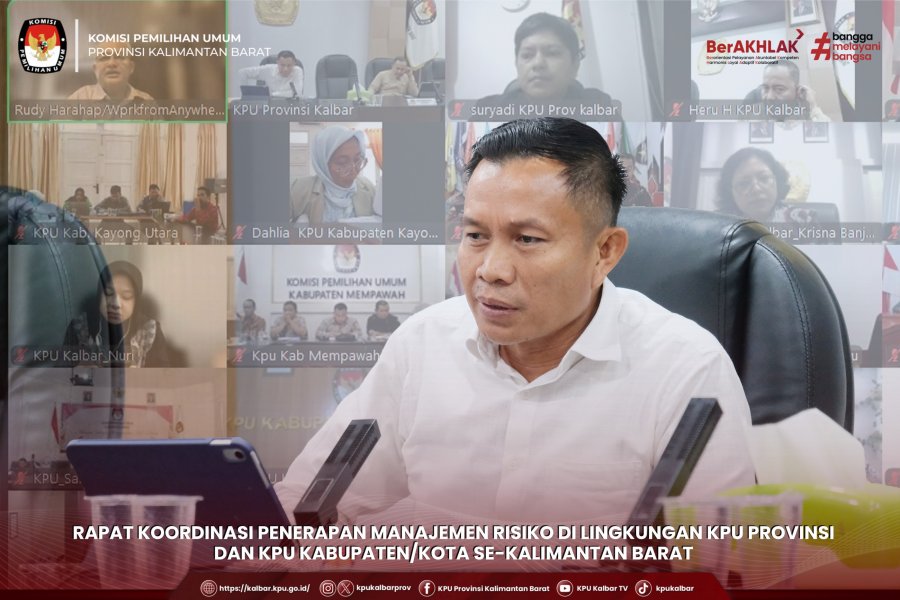 kalbar.kpu.go.id - Pontianak, KPU Kalbar melaksanakan Rapat Koordinasi Penerapan Manajemen Risiko di Lingkungan KPU Provinsi dan KPU Kabupaten/Kota se-Kalimantan Barat, via daring Jum'at (16/5). Peserta dalam kegiatan ini Ketua, Anggota Divisi Hukum dan Pengawasan, Sekretaris, dan Kasubbag KPU Kabupaten/Kota se-Kalimantan Barat, serta hadir sebagai narasumber Kepala Perwakilan BPKP Provinsi Kalimantan Barat Rudy M. Harahap. (adm)