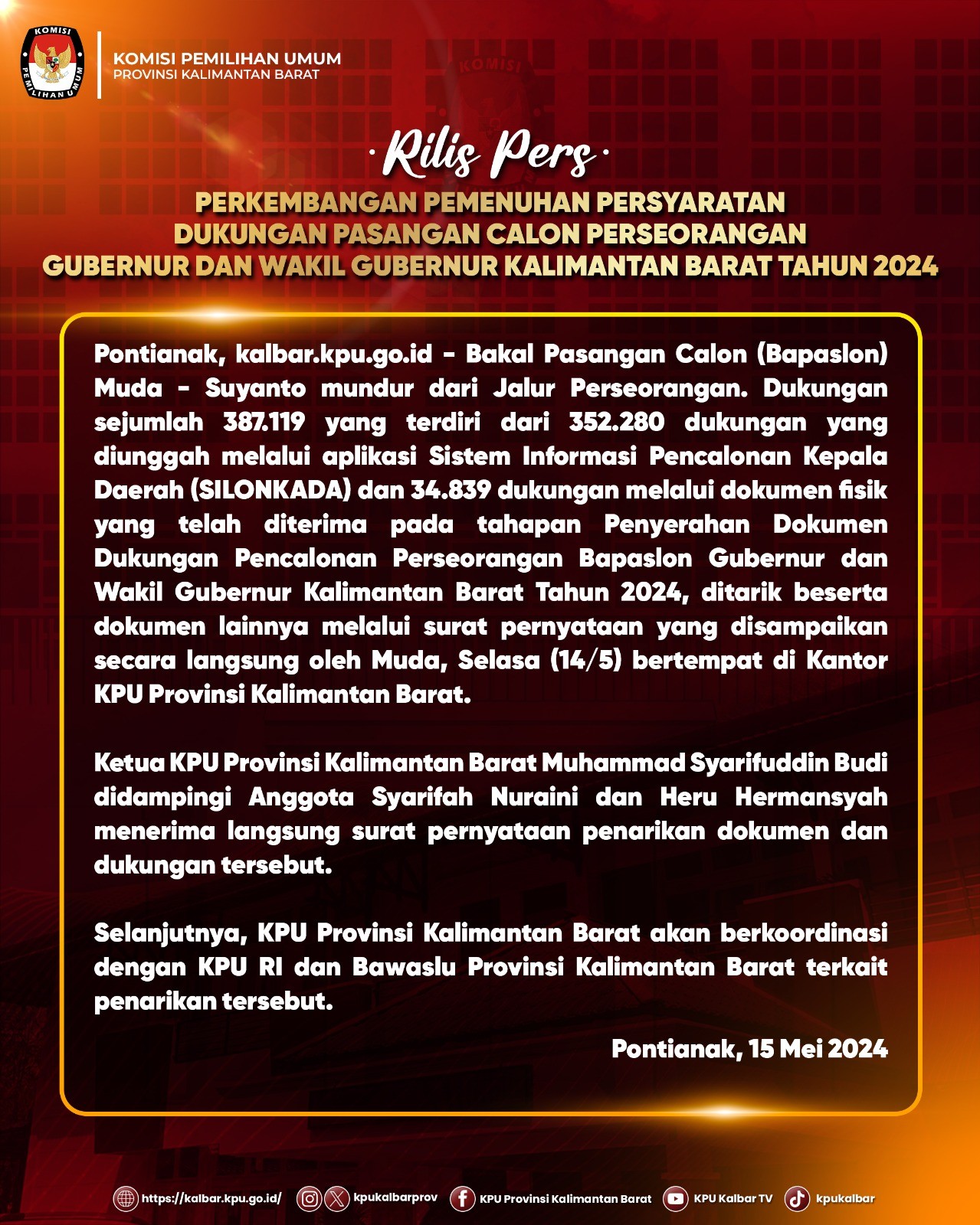 Dukungan sejumlah 387.119 yang terdiri dari 352.280 dukungan yang diunggah melalui aplikasi Silonkada dan 34.839 dukungan melalui dokumen fisik yang telah diterima pada tahapan Penyerahan Dokumen Dukungan Pencalonan Perseorangan Bapaslon Gubernur dan Wakil Gubernur Kalimantan Barat Tahun 2024, ditarik beserta dokumen lainnya melalui surat pernyataan yang disampaikan secara langsung oleh Muda, Selasa (14/5) bertempat di Kantor KPU Provinsi Kalimantan Barat.