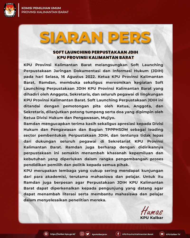 KPU Provinsi Kalimantan Barat melangsungkan Soft Launching Perpustakaan Jaringan Dokumentasi dan Informasi Hukum (JDIH) pada hari Selasa, 16 Agustus 2022. Ketua KPU Provinsi Kalimantan Barat, Ramdan, membuka sekaligus meresmikan kegiatan Soft Launching Perpustakaan JDIH KPU Provinsi Kalimantan Barat yang dihadiri oleh Anggota, Sekretaris, dan seluruh pegawai di lingkungan KPU Provinsi Kalimantan Barat. Soft Launching Perpustakaan JDIH ini ditandai dengan pemotongan pita oleh Ketua, Anggota, dan Sekretaris, dilanjutkan potong tumpeng serta doa yang dipimpin oleh Ketua Divisi Hukum dan Pengawasan, Mujiyo.
