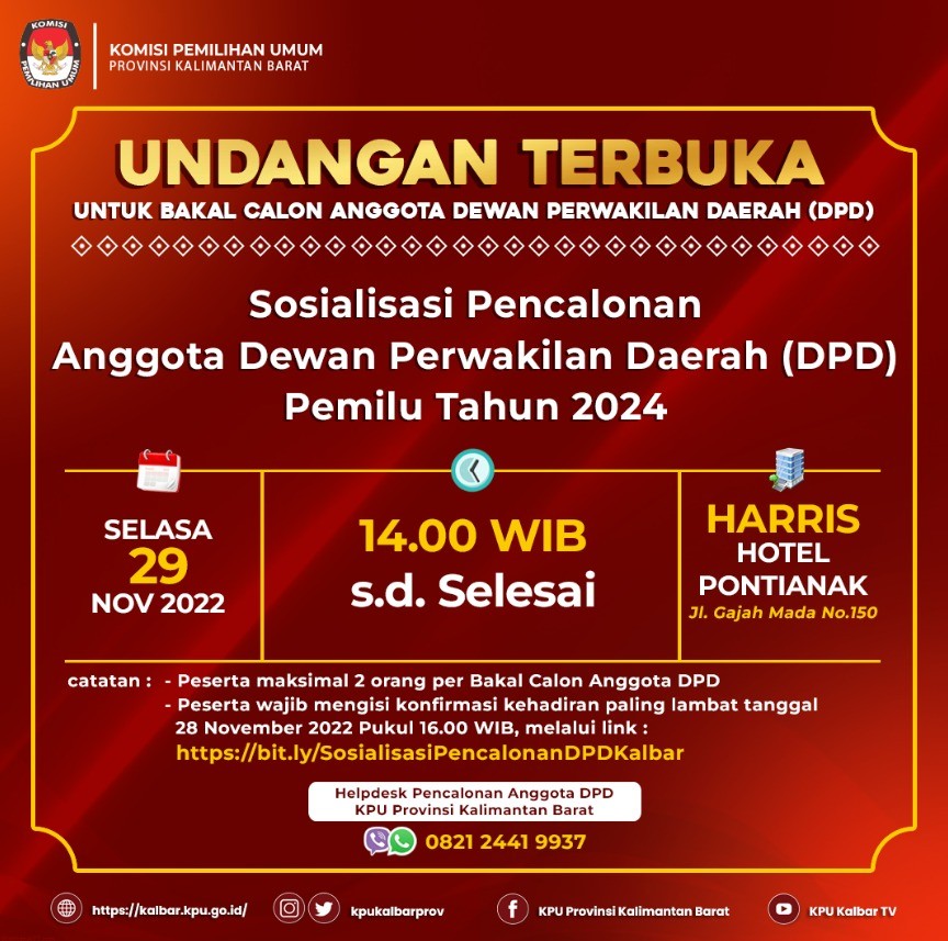 kalbar.kpu.go.id - Berikut disampaikan Undangan Terbuka Sosialisasi Pencalonan Anggota Dewan Perwakialn Daerah perwakilan Provinsi Kalimantan Barat pada Pemilu Tahun 2024.