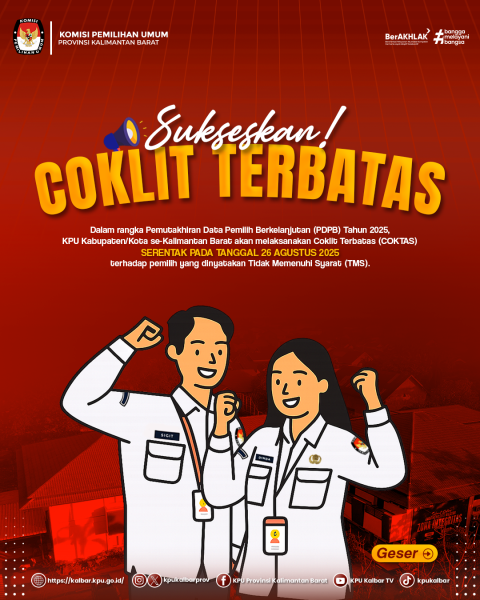 Dalam rangka Pemutakhiran Data Pemilih Berkelanjutan (PDPB), KPU Kabupaten/Kota se-Kalimantan Barat akan melaksanakan Coklit Terbatas serentak pada tanggal 26 Agustus 2025. Kegiatan ini difokuskan untuk pemilih yang dinyatakan Tidak Memenuhi Syarat (TMS), seperti pemilih yang telah meninggal dunia, pindah domisili, atau data yang tidak padan.