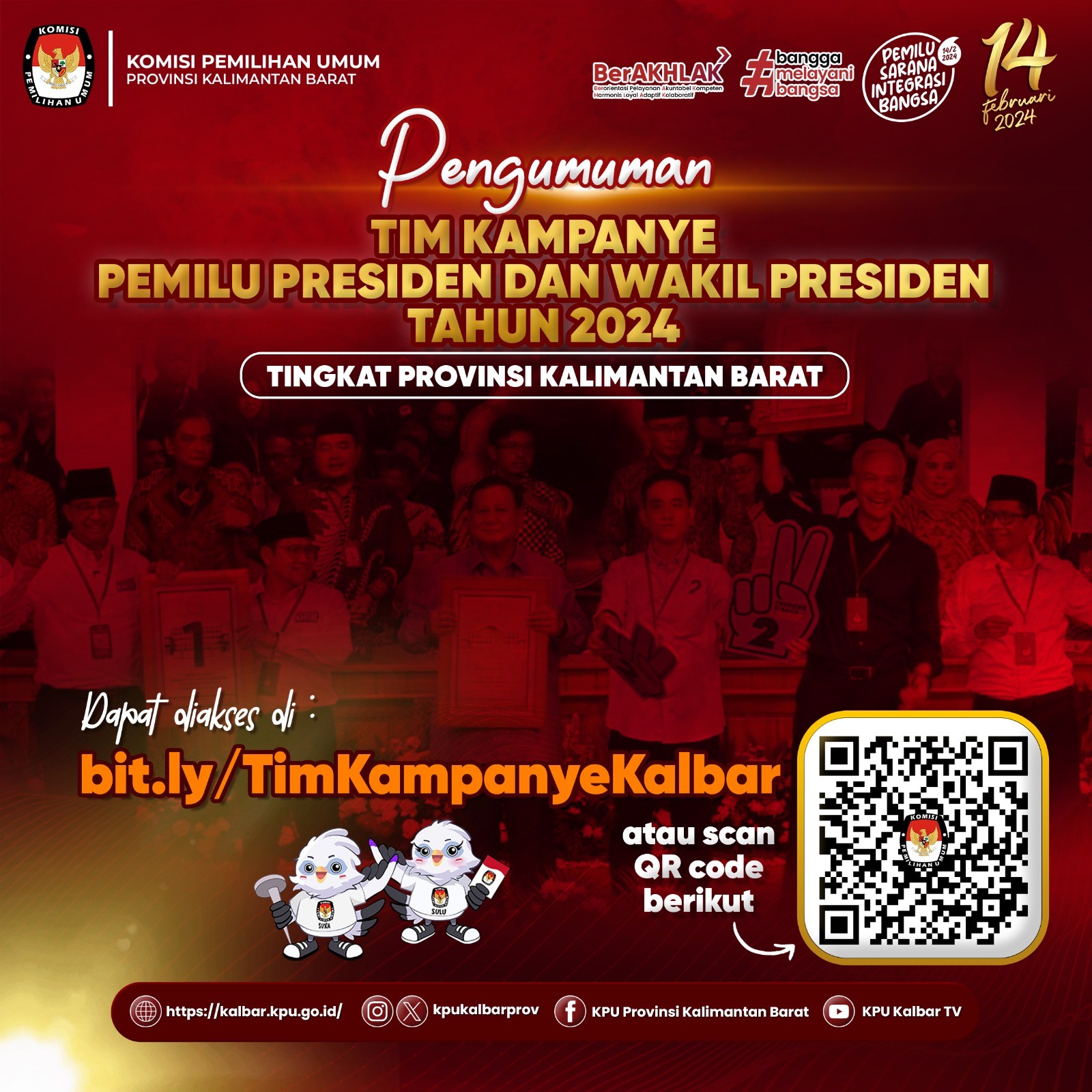 kalbar.kpu.go.id - Pontianak, Berikut disampaikan Tim Kampanye Pasangan Calon Presiden dan Wakil Presiden Tingkat Provinsi Kalimantan Barat pada pemilihan umum Tahun 2024.